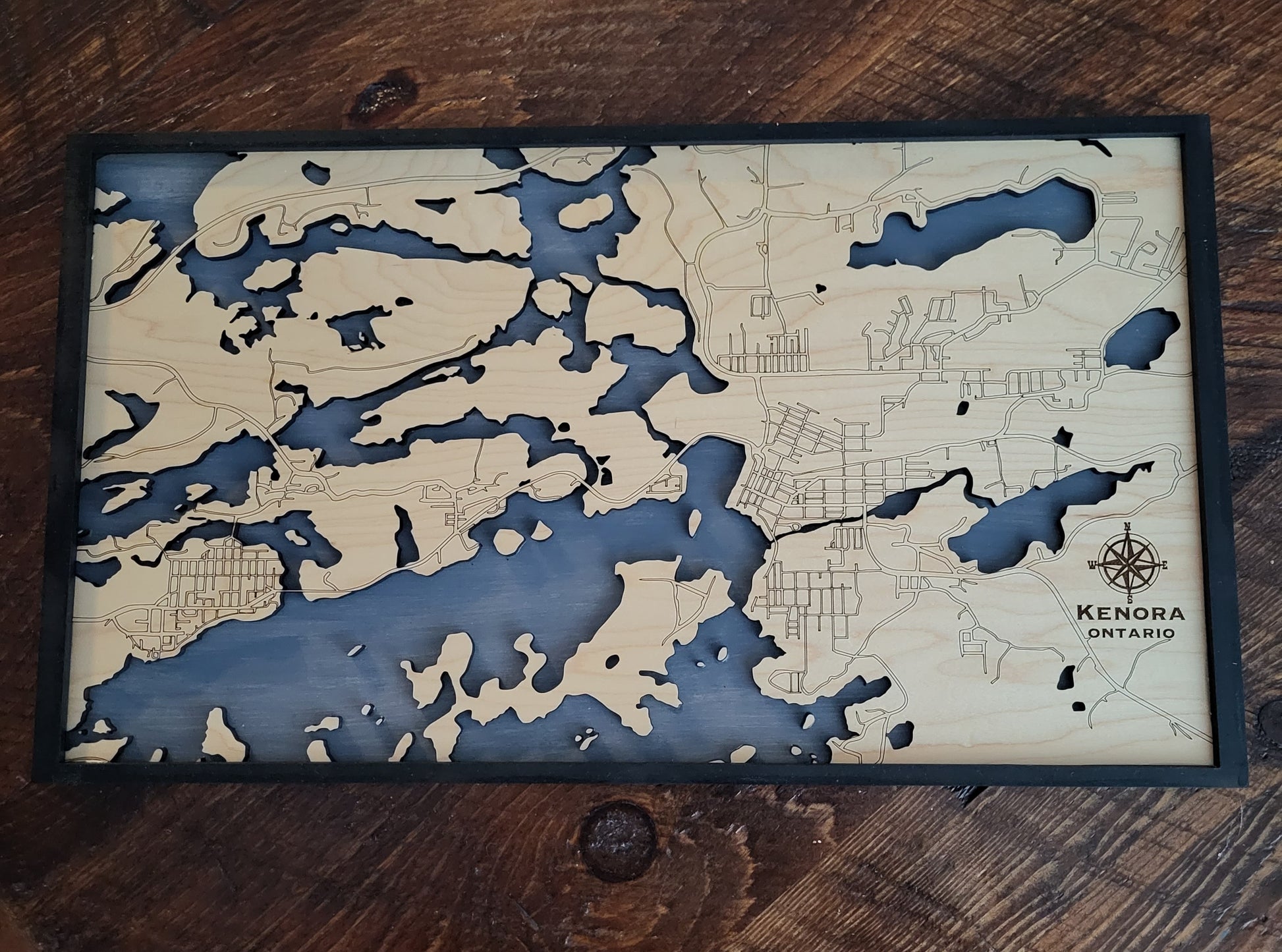 Map of Kenora, ON includes lake and compass.