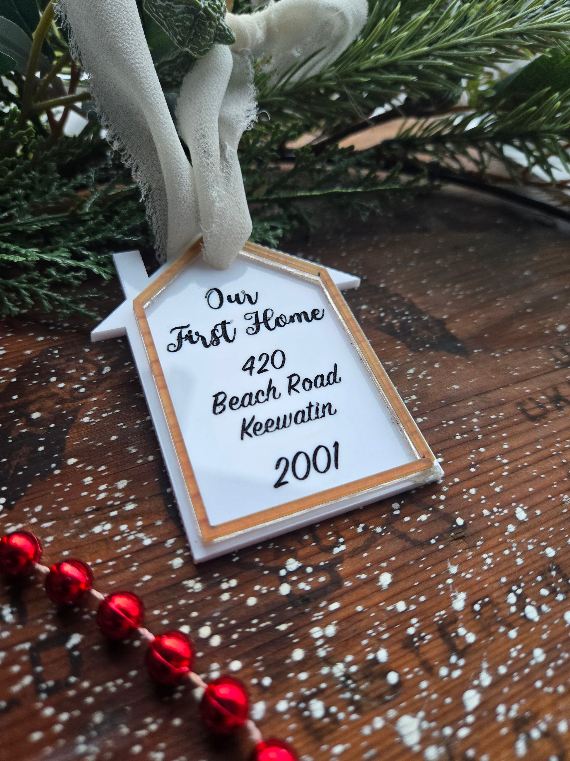 Commemorate a special milestone with this beautifully crafted new house ornament. Made from one layer of ¼" maple wood and ⅛" acrylic, each ornament is engraved with your home address and finished with a white chiffon ribbon for hanging. The mix of natural wood and glossy acrylic creates a timeless, elegant look—perfect for celebrating a first home, new move, or holiday season in a new space. A thoughtful gift for homeowners, newlyweds, or anyone starting a new chapter.