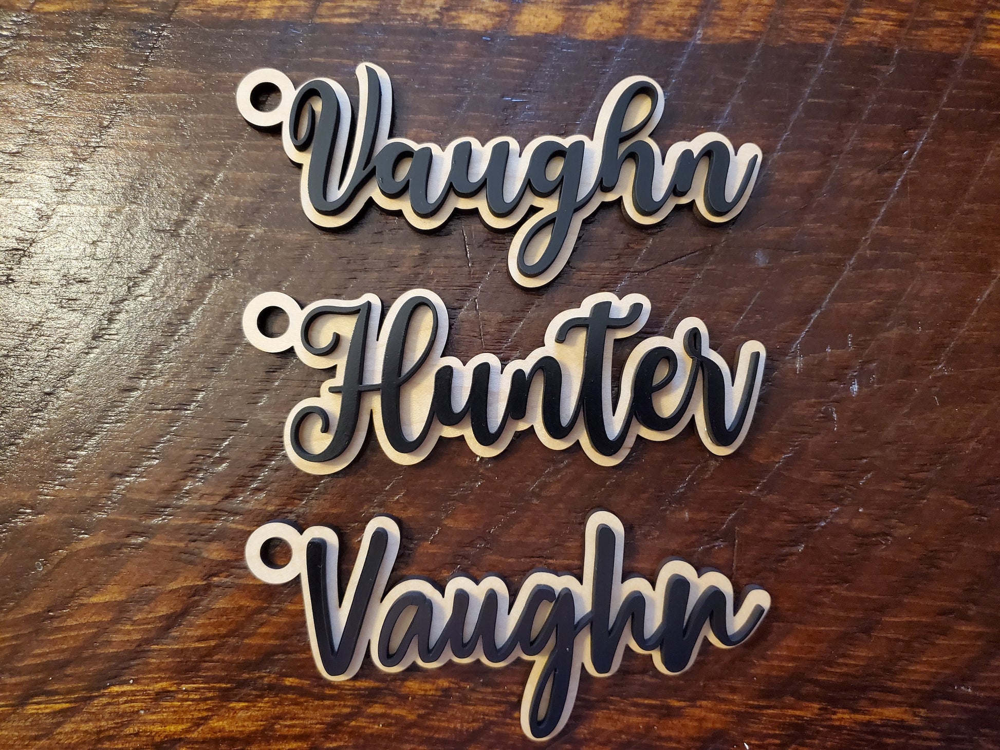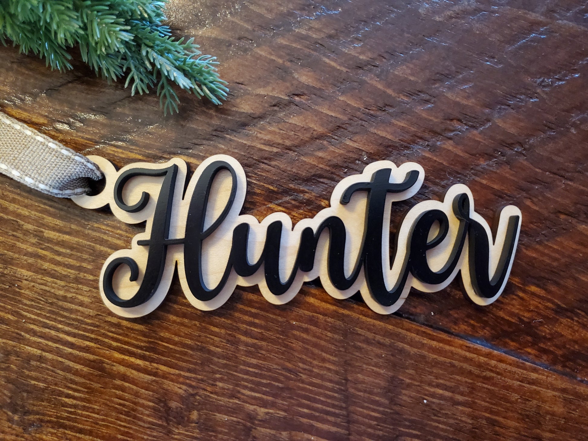Adorable stocking tag in prefinished maple 1/4" thick, comes with ribbon for hanging. Name only style.