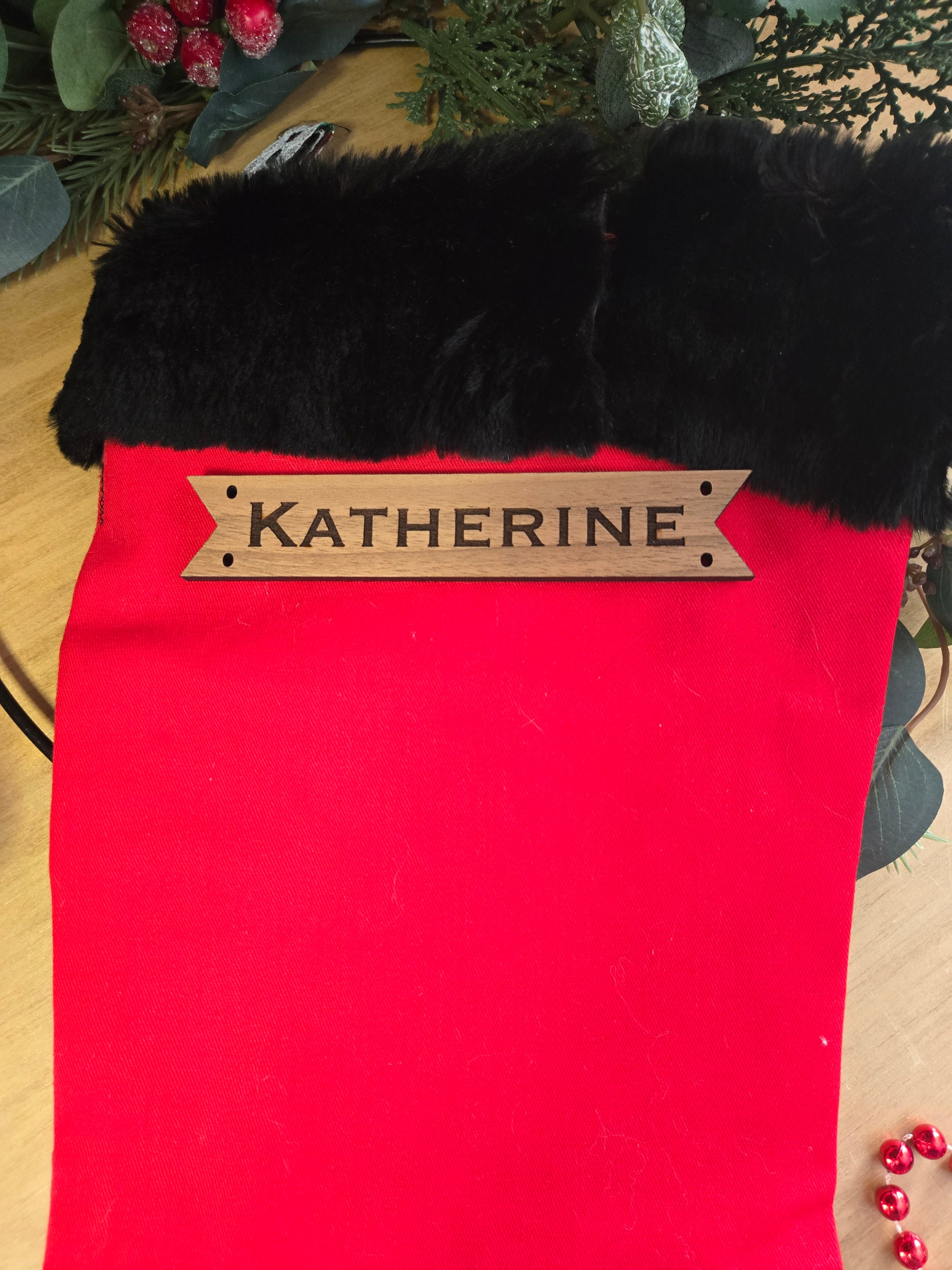 Walnut engraved horizontal stocking tag. This tag comes with 4 holes, it is to be sewn onto your stocking like a button on pants.